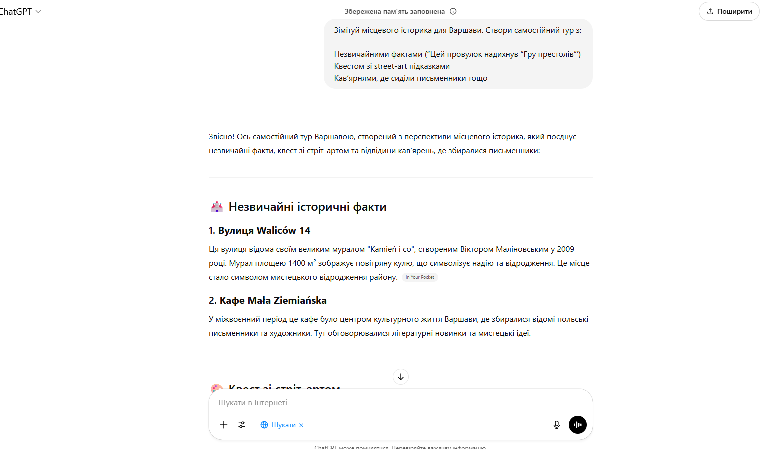 Цей промт також дав хороші результати з цікавими фактами про зазначені місця. Однак розповів лише про ті факти, які були вказані в запиті, тож варто їх розширити чи узагальнити.