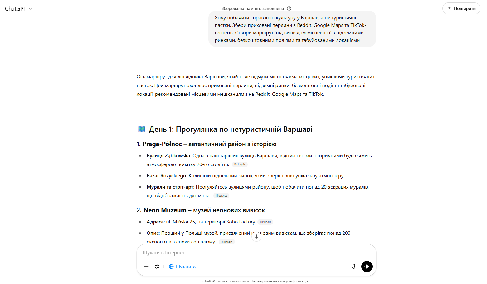 За цим запитом чат надав багато рекомендацій з Вікіпедії – однак були й цікаві варіанти з Reddit та місцевих польських сайтів. Вкінці ШІ порадив хорошого місцевого гіда, до якого варто звернутись. Також варто додати до промту вказування цін на відвідини усіх місць.
