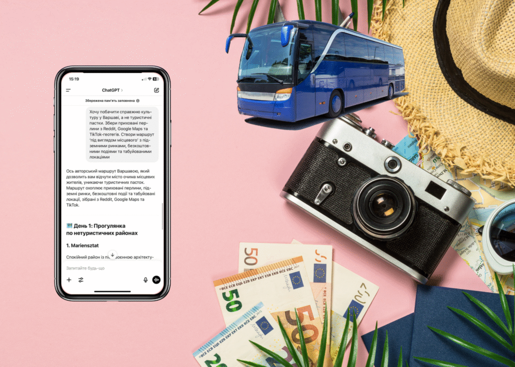 “Хочу побачити справжню культуру в [місті], а не туристичні пастки. Збери приховані перлини з Reddit, Google Maps та TikTok-геотегів. Створи маршрут ‘під виглядом місцевого’ з підземними ринками, безкоштовними подіями та табуйованими локаціями”.