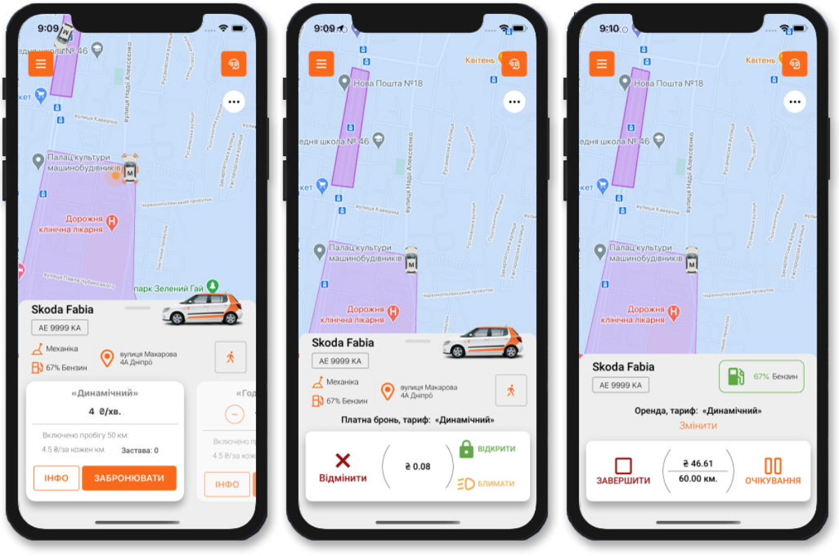 Забрати автомобіль можна, відкривши за допомогою застосунку. Завершити поїздку можна в будь-якій зазначеній на мапі спеціальній зоні.