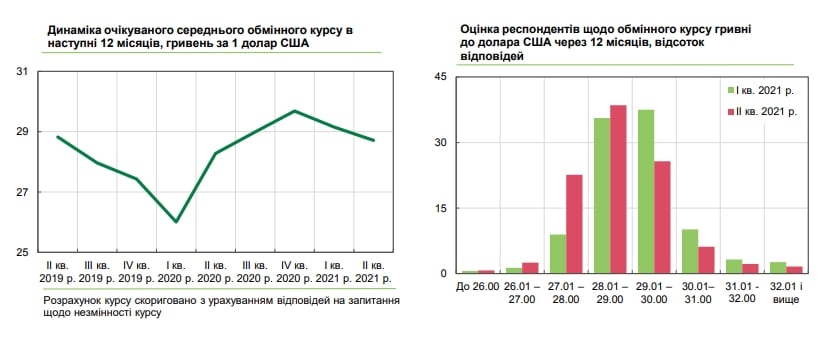 При цьому, у дослідженні НБУ ділових очікувань підприємств України за I квартал 2021 року, 73% респондентів очікували обмінний курс через рік в межах від 28,01 грн/$ до 30 грн/$, а середнє значення становило 29,15 грн/$.