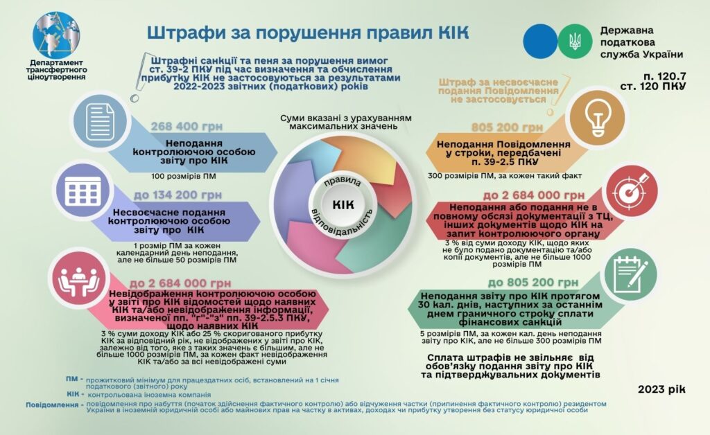 Неподання звіту про наявність частки в іноземній компанії чи зміни у володінні тягне накладення штрафу розміром 300 прожиткових мінімумів для працездатної особи, встановленого законом на 1 січня звітного року (нині близько 800 тис. грн).