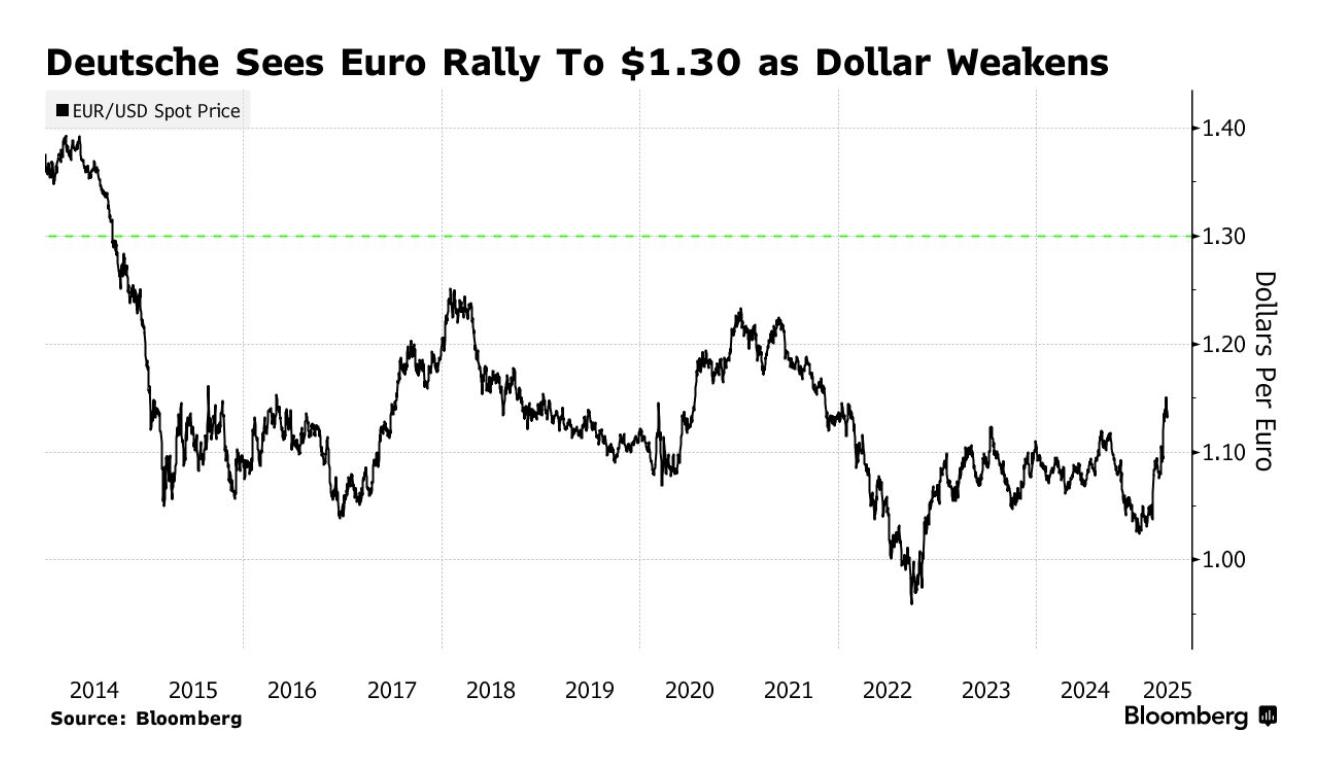 Відтак, банк прогнозує зростання євро до рівня $1,30 до кінця 2027 року, що востаннє спостерігалося у 2014 році і значно перевищує середній прогноз Bloomberg на рівні $1,15.