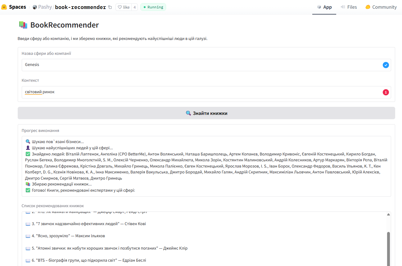 Користувач обирає сферу (IT, банкінг, фермерство) або компанію (Genesis, Universe Group тощо). Платформа знаходить публічно активних фахівців, аналізує їхні інтерв’ю та статті й формує список книг, які ці люди рекомендують.