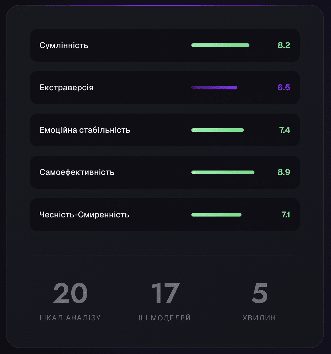 LITI оцифровує особистісні риси кандидата, перетворюючи їх на числові показники для зручності HR-фахівців та менеджерів. Технологія аналізує текстові записи розмов або відео інтерв’ю, оцінюючи структуру мовлення, темп, добір слів, зміст, самопрезентацію та реакції на ситуації. Відповідно до результатів, ШІ видає оцінку за 110 пунктами у відсотках.