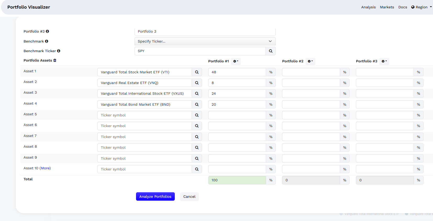 Backtest Portfolio. Інструмент моделює інвестиційні стратегії, використовуючи минулі ринкові дані для оцінки історичної прибутковості, а також ризику та прибутку. Можна порівняти до трьох портфелів за обраним показником, включати періодичні внески або зняття коштів та визначати стратегії ребалансування. Сервіс показує річну прибутковість, стандартне відхилення, коефіцієнт Шарпа й коефіцієнт Сортіно (показують, наскільки ефективно працює інвестиція з урахуванням ризику) та кореляцію з бенчмарком.