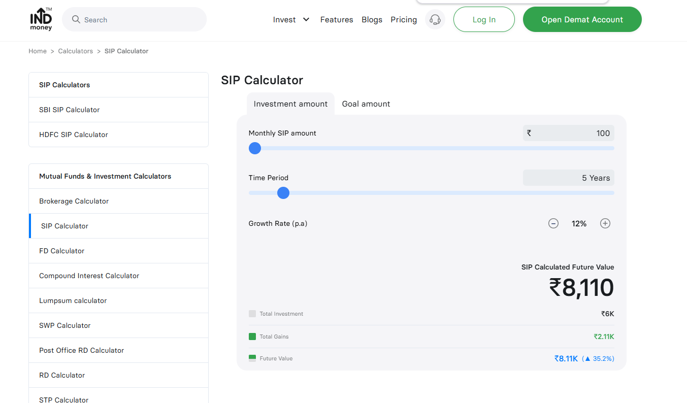 Indmoney SIP Calculator. Калькулятор розраховує майбутню вартість інвестицій SIP на основі суми SIP, тривалості інвестиції та очікуваної норми прибутку. Сервіс відображає загальну інвестовану суму, очікувану майбутню вартість інвестиції та загальний прибуток, використовуючи формулу складних відсотків.