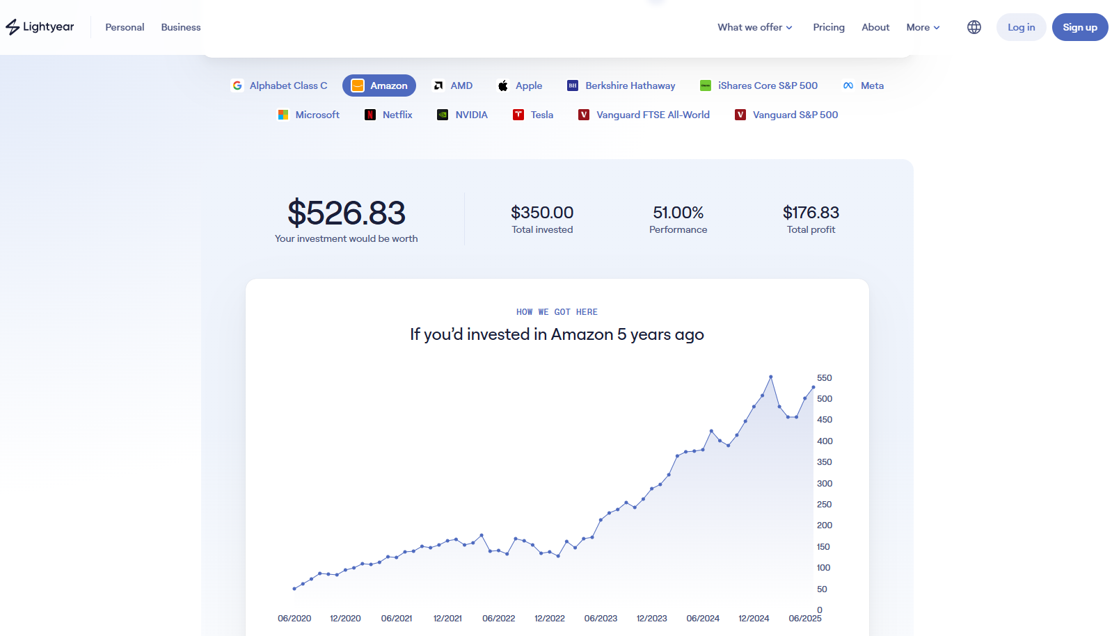 Lightyear Ticker Time Machine. Цей інструмент дає змогу моделювати минулі інвестиції в акції великих компаній (наприклад, Amazon, Google, Apple тощо) на основі історичних темпів зростання протягом останніх 20 років. Необхідно обрати компанію, початкову інвестицію та необов’язкові щомісячні внески. Калькулятор розраховує загальну вартість на сьогодні, загальну інвестовану суму, відсоток прибутковості та загальний прибуток, припускаючи реінвестування дивідендів.
