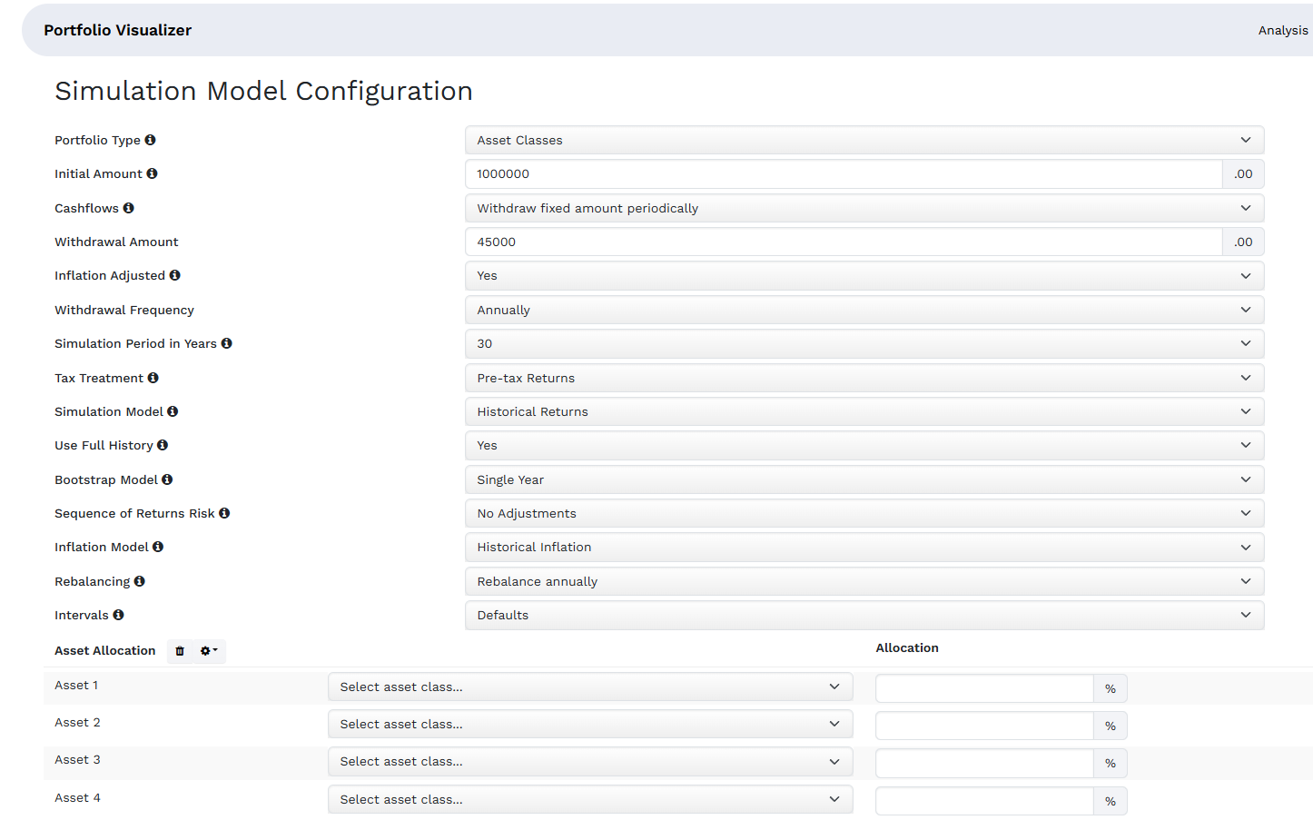 Monte Carlo Simulation. Інструмент прогнозує майбутню ефективність портфеля за різними сценаріями, зокрема для довгострокового зростання. Підтримує кілька моделей моделювання прибутковості (історична, прогнозована, статистична) та моделі зняття коштів (фіксована сума, фіксований відсоток, на основі очікуваної тривалості життя). Можна налаштовувати моделі інфляції, частоту ребалансування та податковий режим.