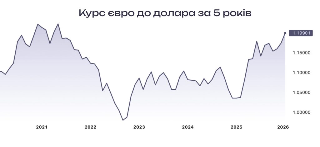 Курс євро побив кількарічний рекорд до долара і сягнув сьогодні рівня 1,1989. Такого дорого євро до долара коштував ще в червні 2021 року.