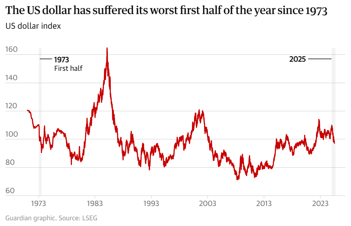 На графіку нижче зображено індекс долара США щодо кошика основних валют у період з 1973 до 2025 року. Попри те, що в різні роки долар падав ще нижче, у 2025 році зафіксовано найрізкіше падіння саме за перші 6 місяців року – понад 10%. Такого швидкого падіння не було з 1973 року.