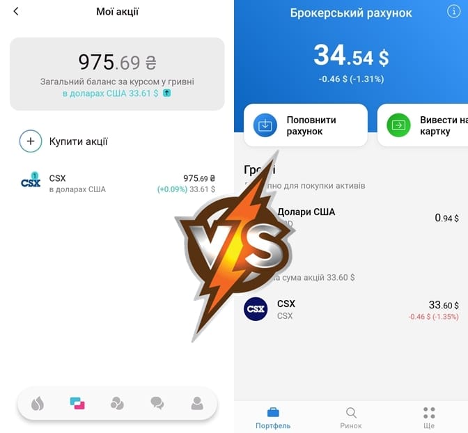 Далі в нас жодної інвестиційної стратегії і ми просто обрали найдешевшу доступну акцію в обох застосунках і придбали її. Це виявилася CSX вартістю 35 доларів.