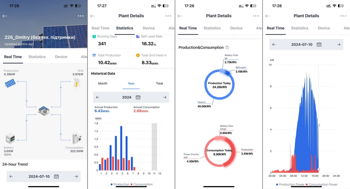 Середньодобове споживання електроенергії у будинку Дмитрія становить 15 кВт. Влітку сонячні панелі забезпечують повну автономність будинку, тоді як взимку споживання зростає, і сонячна генерація забезпечує від 200 до 350 кВт з необхідних 450 кВт на місяць.