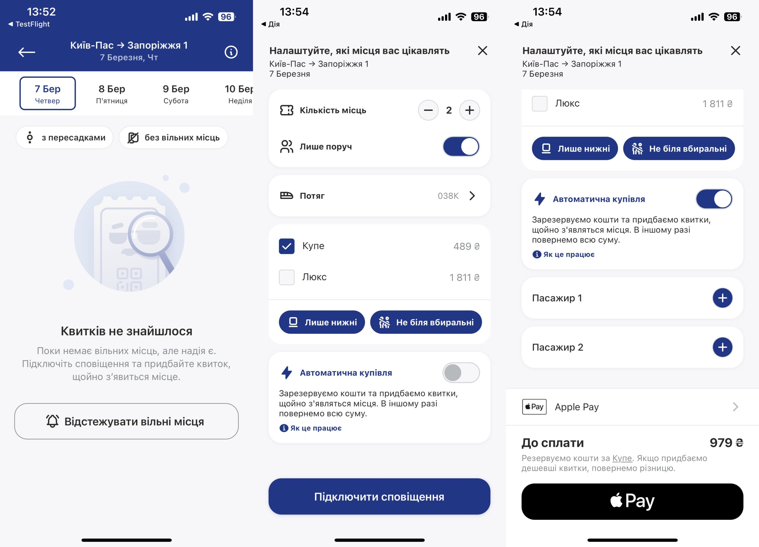 У випадку моніторингу конкретного поїзда також можливо увімкнути функцію автоматичної купівлі квитків. Для цього треба внести дані пасажирів та оплатити замовлення: при активації функції одразу відбуватиметься зняття коштів, а у випадку, якщо моніторинг буде скасований або потрібні квитки не знайдуться, кошти повернуться на картку автоматично.