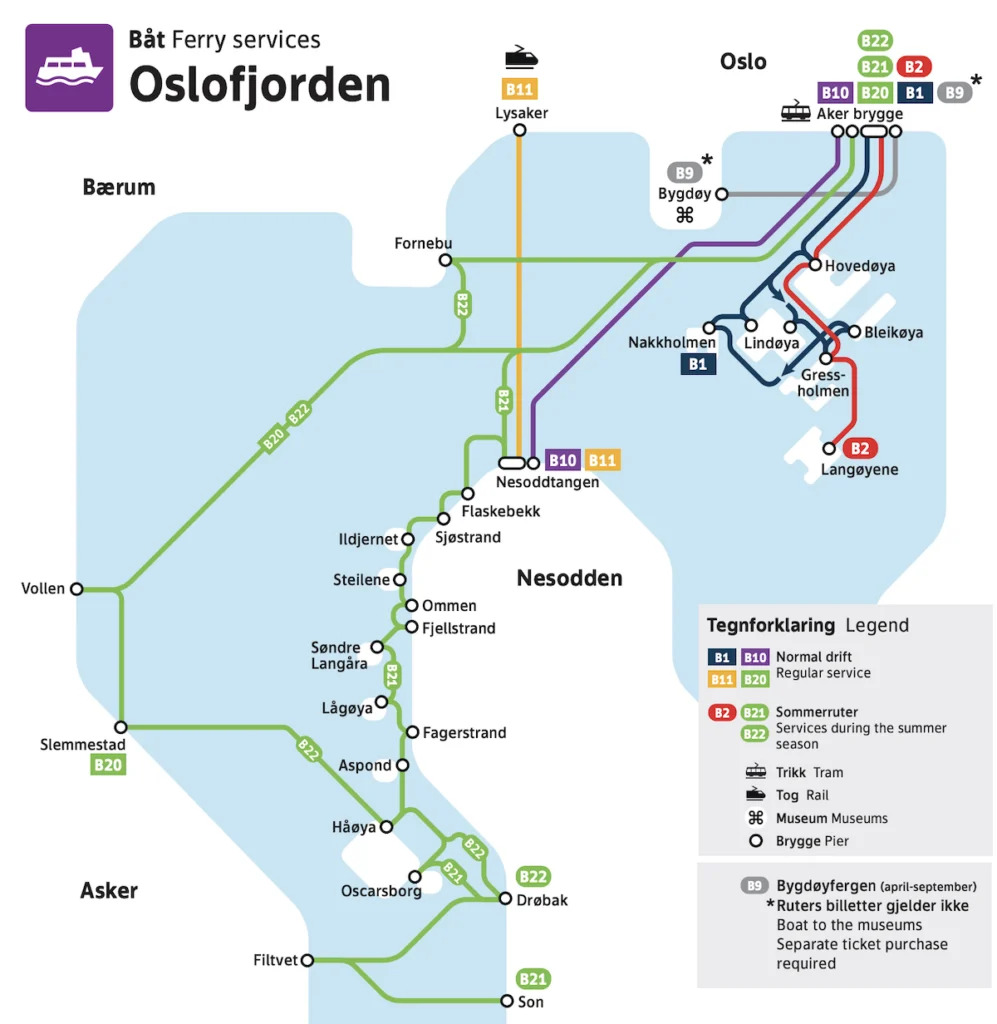 Поромами можна дістатися до островів навколо Осло. Пороми відправляються від Aker Brygge (переправа біля мерії Осло). Інтервал рейсів – кожні 10-15 хвилин.