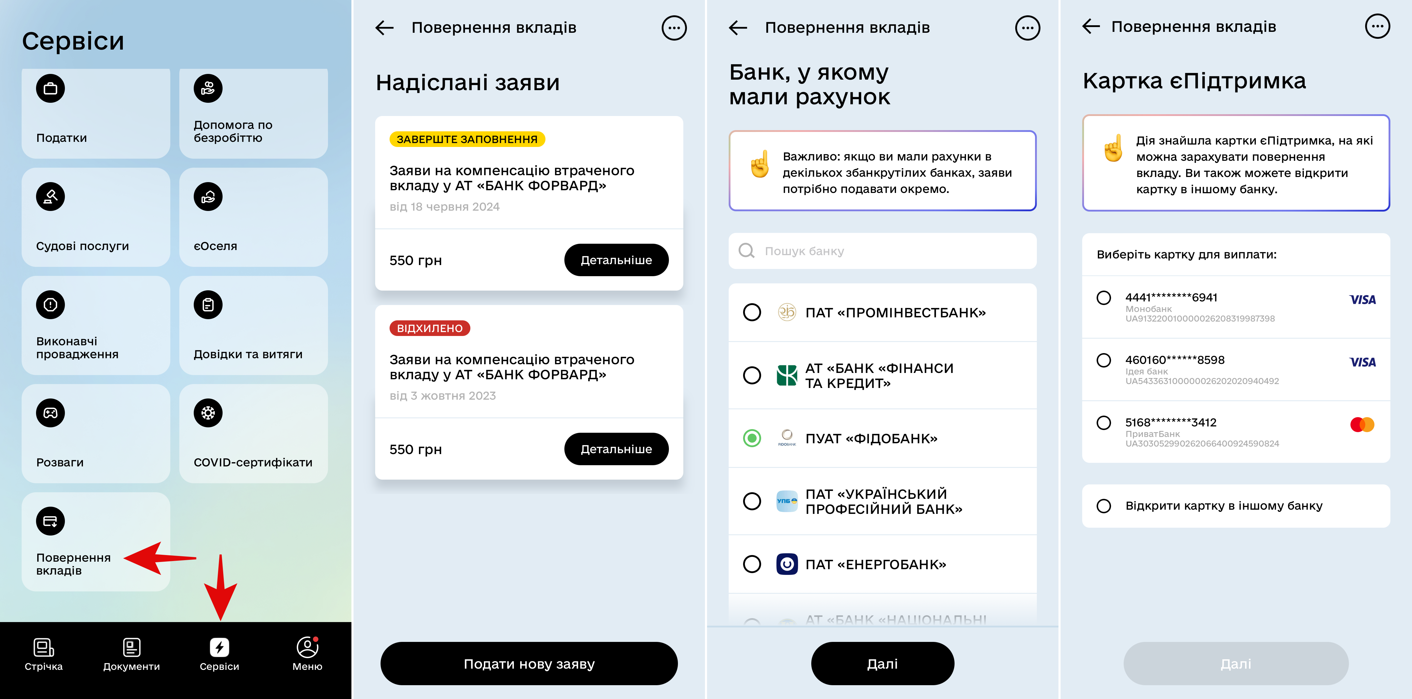 Разом з цим, подати заяву на повернення грошей з ліквідованих банків можна через застосунок ДІЯ. Гроші повертаються на картку єПідтримка і за потреби ДІЯ запропонує відразу відкрити її у партнерському банку. Надалі отримані гроші з картки єПідтримка можна перерахувати на потрібний рахунок чи картку в будь-якому банку.