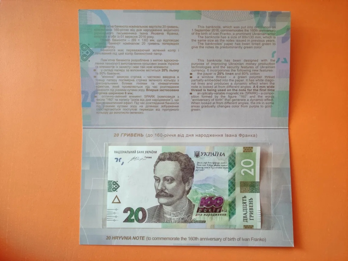 Відмінністю від звичайної банкноти є напис “160 років від дня народження” біля портрета.
