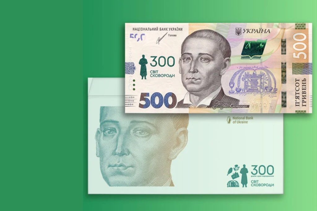 Відмінністю від звичайної банкноти є напис “300 Світ Сковороди” біля портрета.