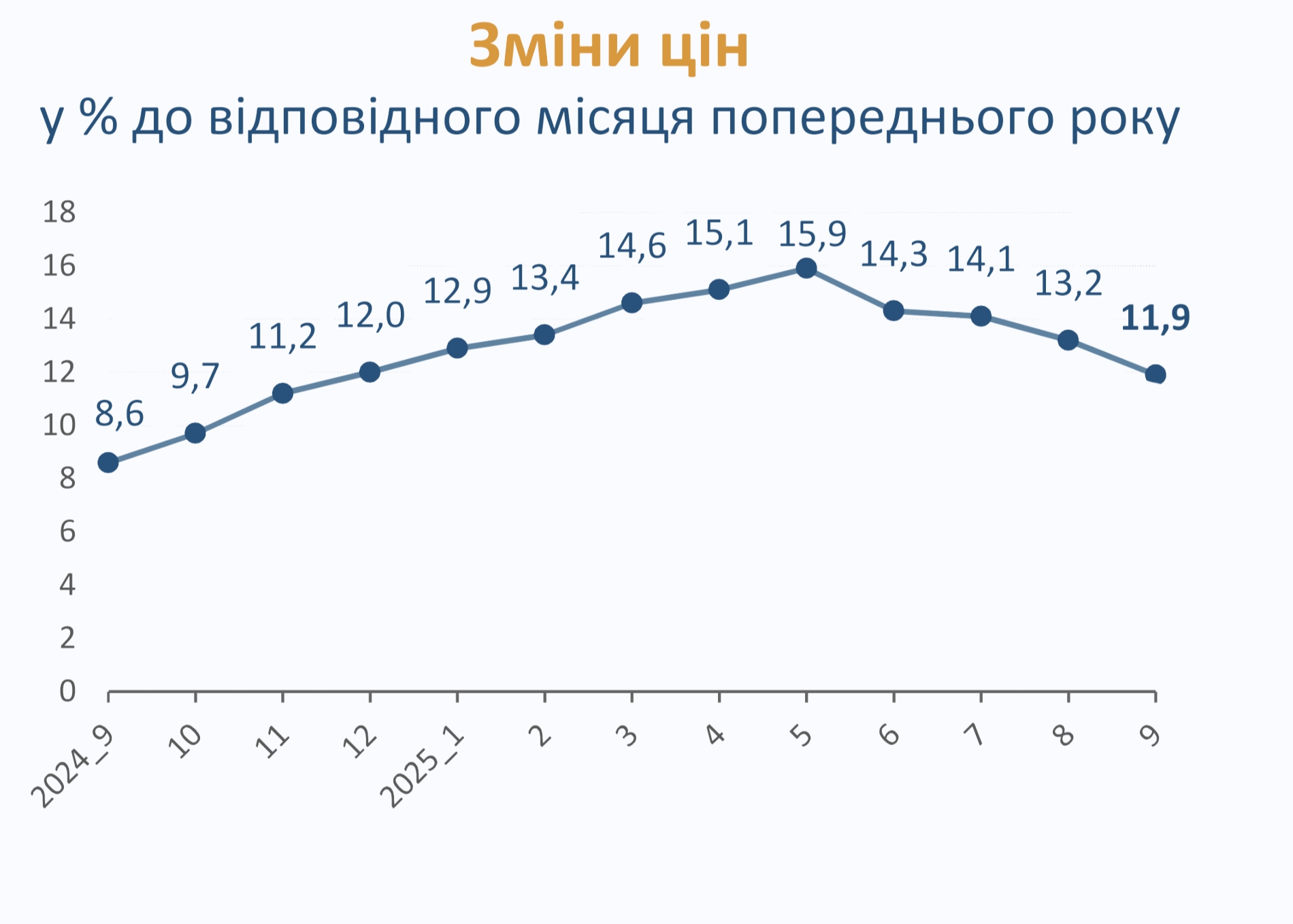 Річна інфляція у вересні сповільнилася до 11,9% порівняно з 13,2% у серпні. Дані опублікувала Держставна служба статистики. Востаннє такий низький рівень інфляції фіксували в грудні 2024 року (12%).