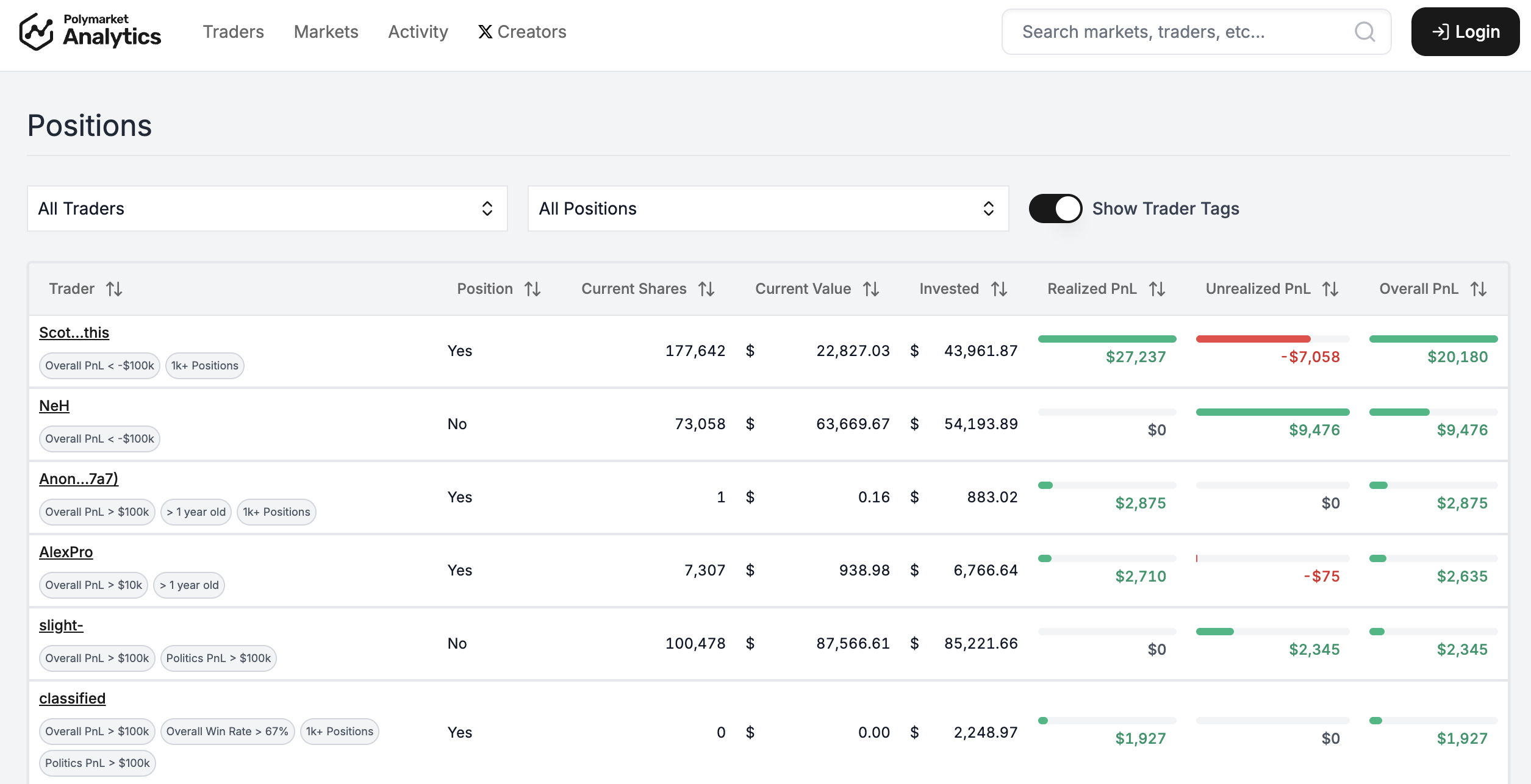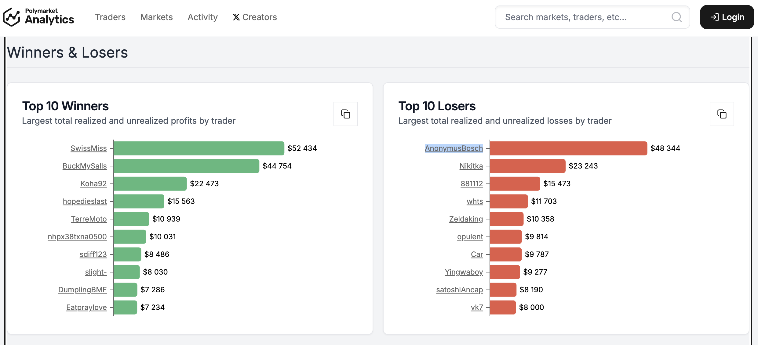 Оскільки торги відбуваються на блокчейні, усі угоди та результати є публічними – тож можна побачити, хто й скільки заробив на певних ставках. Відтак ці дані доступні на аналітичному сервісі Polymarket Analytics, який агрегує та візуалізує відкриті дані Polymarket, дозволяючи бачити точні суми виграшів та результати завершених ринків.