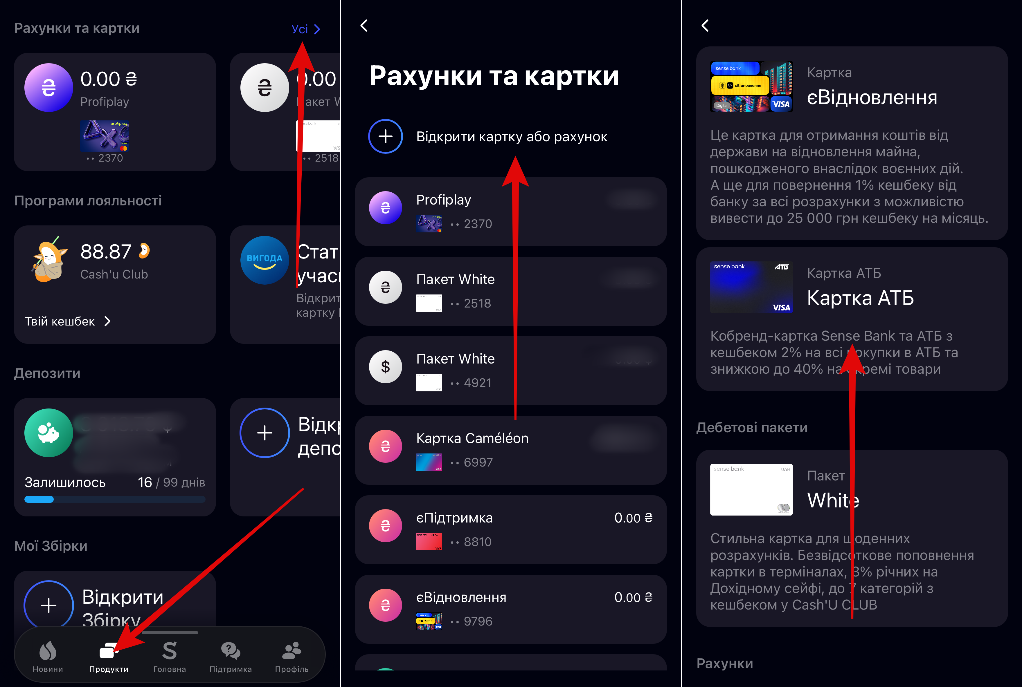 Для нових клієнтів картку АТБ можна оформити онлайн відразу при відкритті рахунку з авторизацією через застосунок ДІЯ. Для дійних клієнтів в меню Sense SuperApp необхідно перейти в нижньому меню в розділ “Продукти” і далі в блоці “Рахунки та картки” натиснути “Усі”. Після цього обрати “Відкрити картку” і вибрати серед доступних АТБ. Далі натиснути знизу екрану “Активувати” і вказати смс-код. Картка буде доступною миттєво.