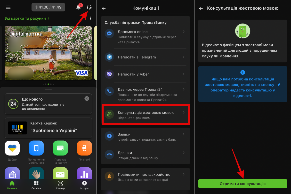 Для отримання послуги у Приват24 (Android | iOS) необхідно перейти в розділ “Комунікації” (значок навушників у правому верхньому куті” та обрати “Консультація жестовою мовою”.