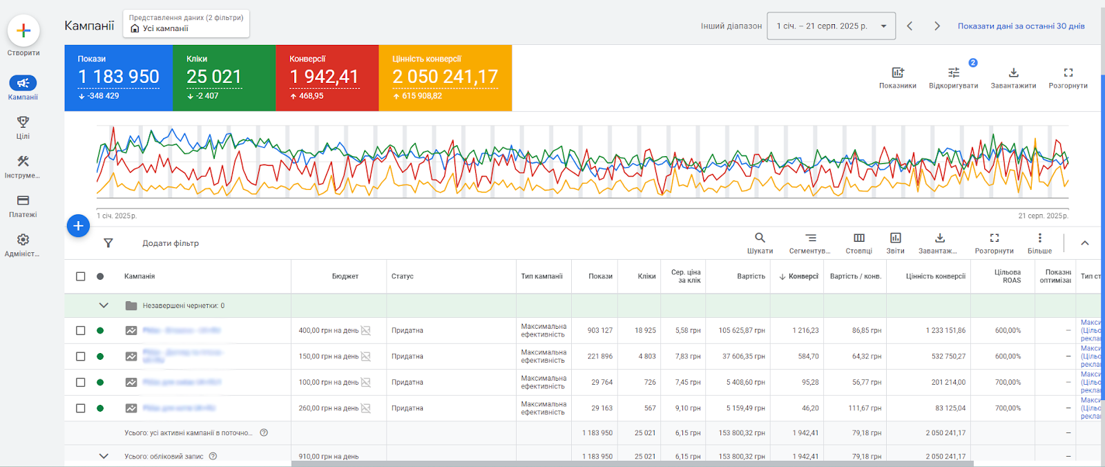 Отже, давайте до результатів. Візьмемо наш магазин в періоді з 1 січня по 21 серпня 2025 року — час активної роботи з рекламою.