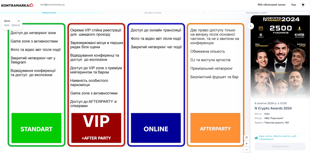 Придбати квиток на N Crypto Awards 2024 можна за посиланням. Ціни варіюються від 1500 до 6500 грн: