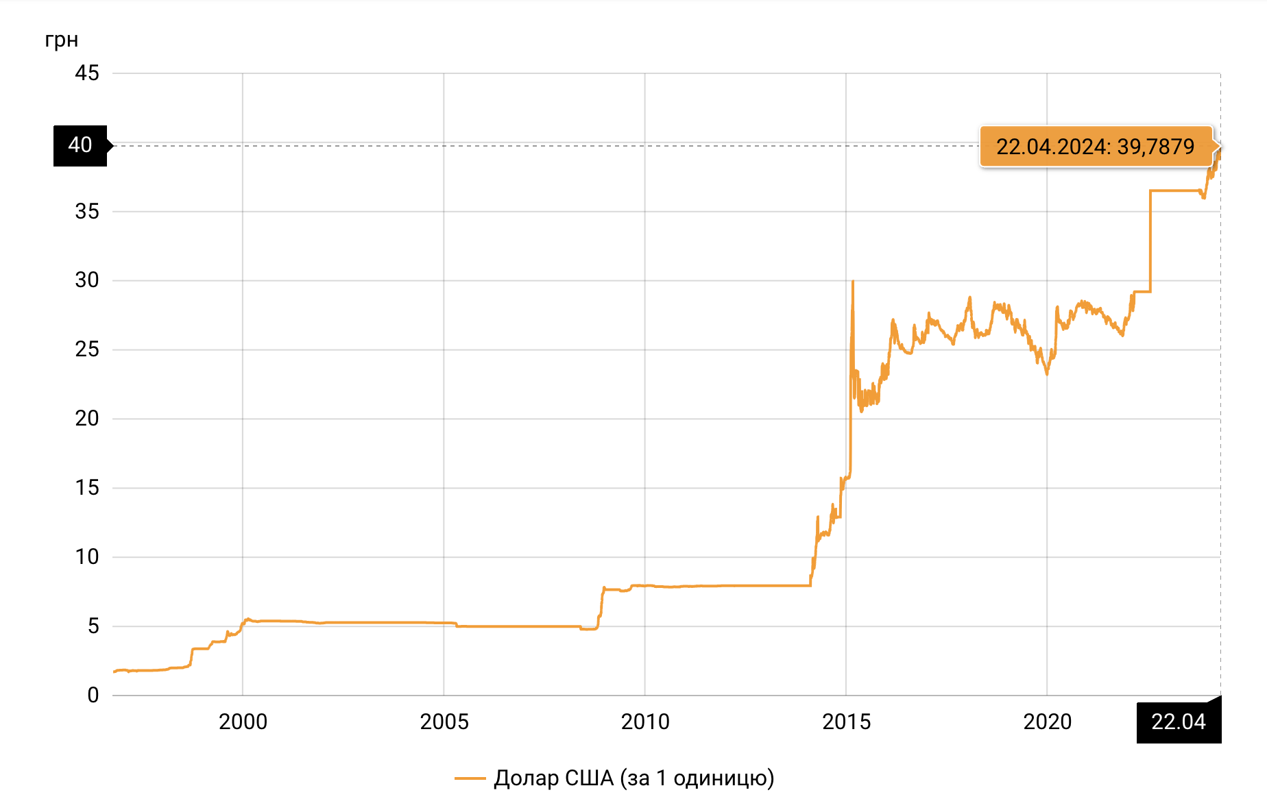 Національний банк України на понеділок 22 квітня встановив офіційний курс гривні до долара на рівні 39,79 грн/$. Це новий історичний рекорд. На п’ятницю 19 квітня курс гривні до долара становив 39,60 грн/$ і то також був історично найбільшим показником.