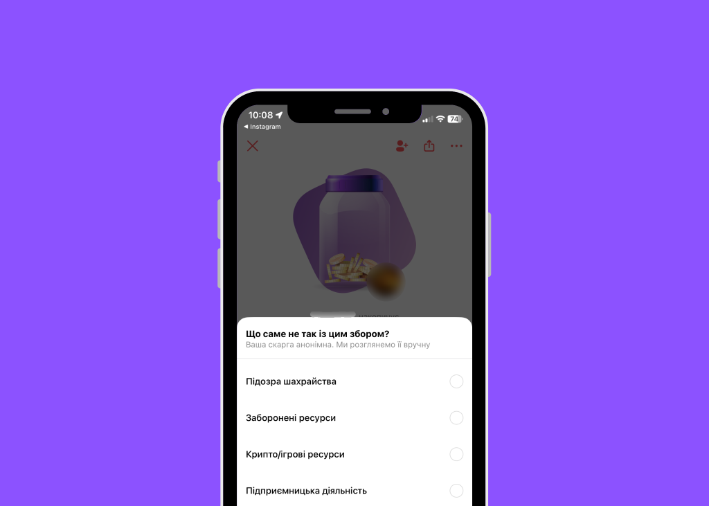 Для скарги необхідно відкрити збір, натиснути на три крапки у верхньому меню та вибрати опцію “Поскаржитися на цей збір”. Є 5 причин для скарг: шахрайство, заборонені ресурси, крипто/ігрові ресурси, підприємницька діяльність або досягнення мети банки.