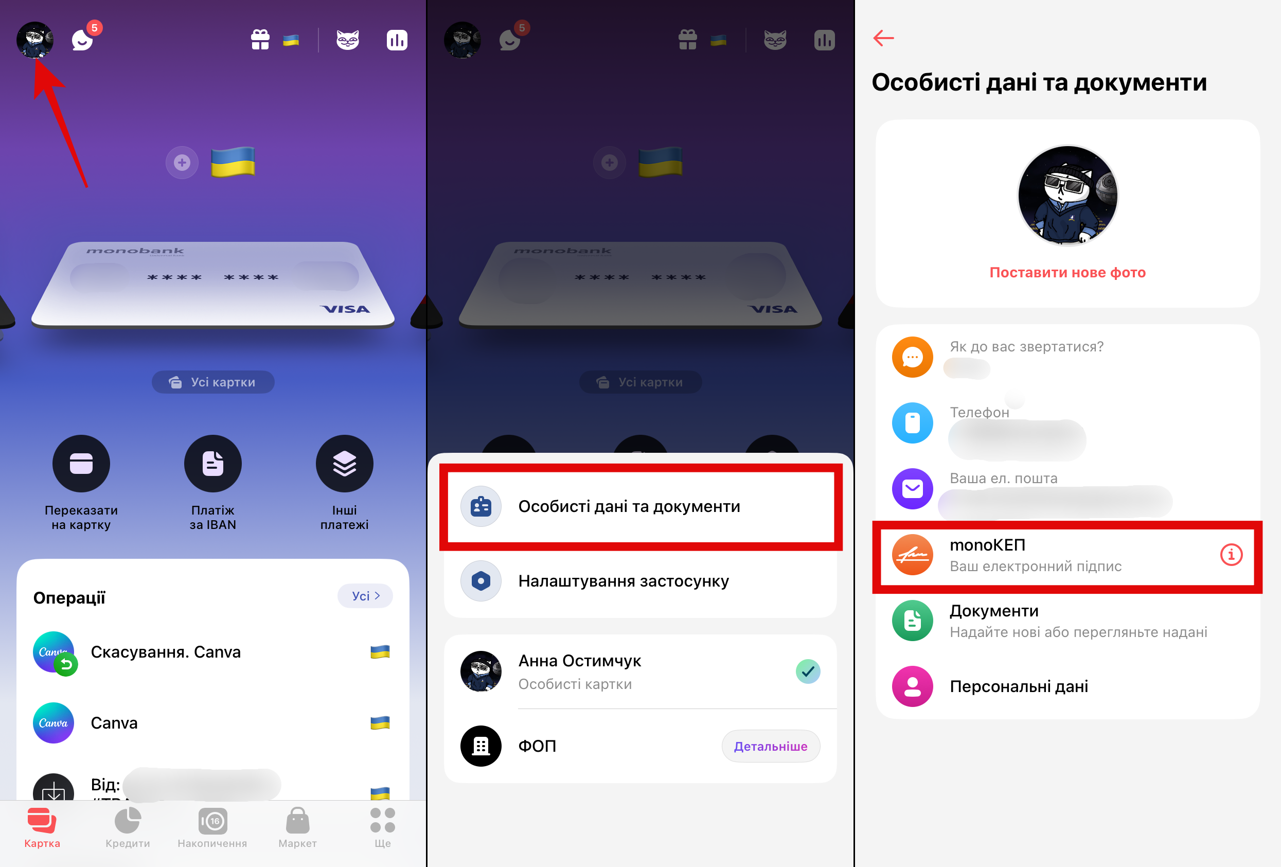 Для створення monoКЕП необхідно натиснути на аватарку – “Особисті дані та документи” – “monoКЕП”. Після цього – придумати пароль та підтвердити свою особу через фото.
