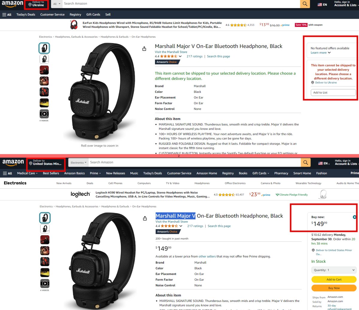 Також іноді деякі товари доступні лише в США. Наприклад, покупці з України не можуть замовити навушники Marshall Major V, лише американці.