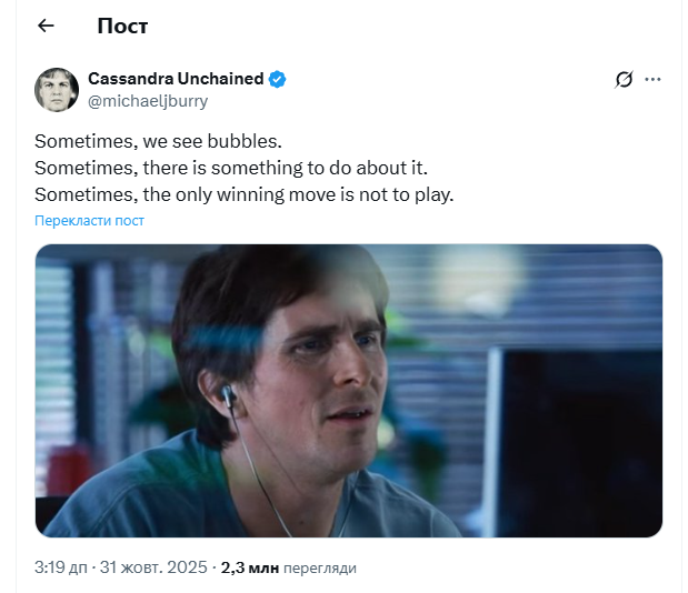 Пост в Х – це цитата з фільму “WarGames” 1983 року, де штучний інтелект усвідомлює, що будь-який варіант ядерної війни призведе до взаємного знищення. Таким чином, Беррі натякнув, що спекуляції на ринку AI можуть завершитися руйнівно, і що утримання від гри — найрозумніша стратегія.