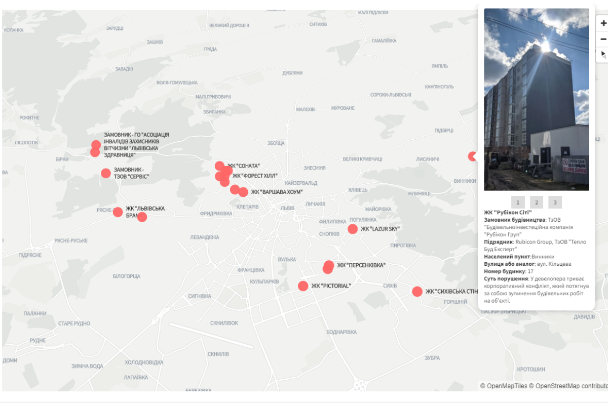 Ознайомитись з мапою проблемних забудов можна за посиланням. На ній позначені проблемні забудовники. Після натискання з’являється детальніша інформація, зокрема адреса та суть порушення.