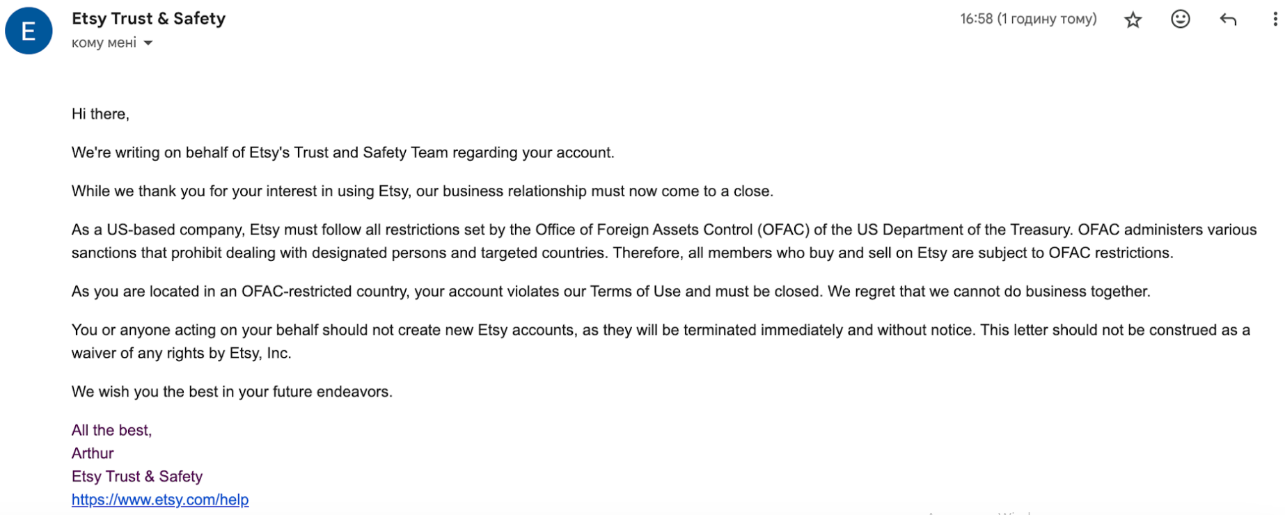 Офіційно Etsy блокує продавців з регіонів, які підпадають під санкції США – наприклад, Криму, “ЛНР”, “ДНР”. Однак насправді обмежують акаунти користувачів не лише з давно окупованих Росією територій, а й з наближених до лінії бойових дій.