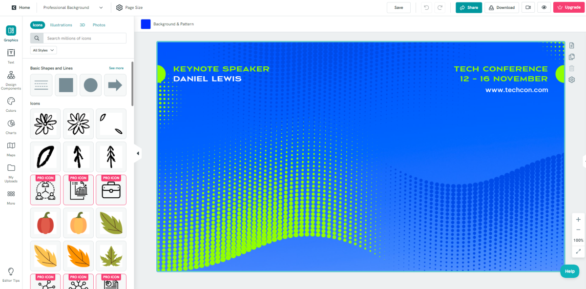 Canva містить багато графічних елементів, можна додавати графіку, діаграми, власні фото, текст. Доступно багато різних шрифтів.