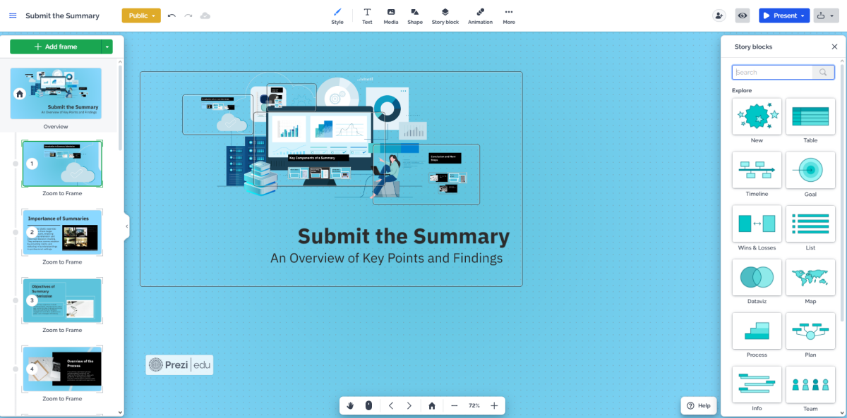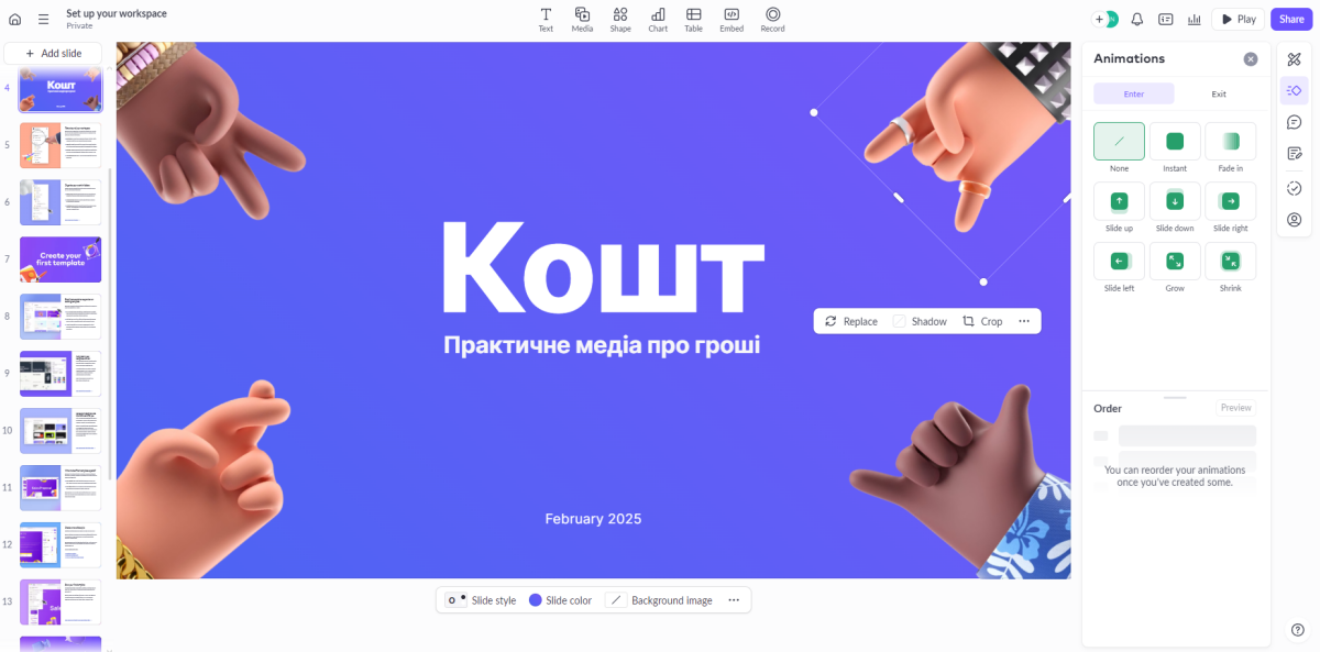 Безпосередньо в презентації можна міняти колір, розмір, розташування, вигляд об`єкта, додавати картинки з наявних у сервісі, додавати й міняти відео тощо. Однак сервіс працює лише англійською.