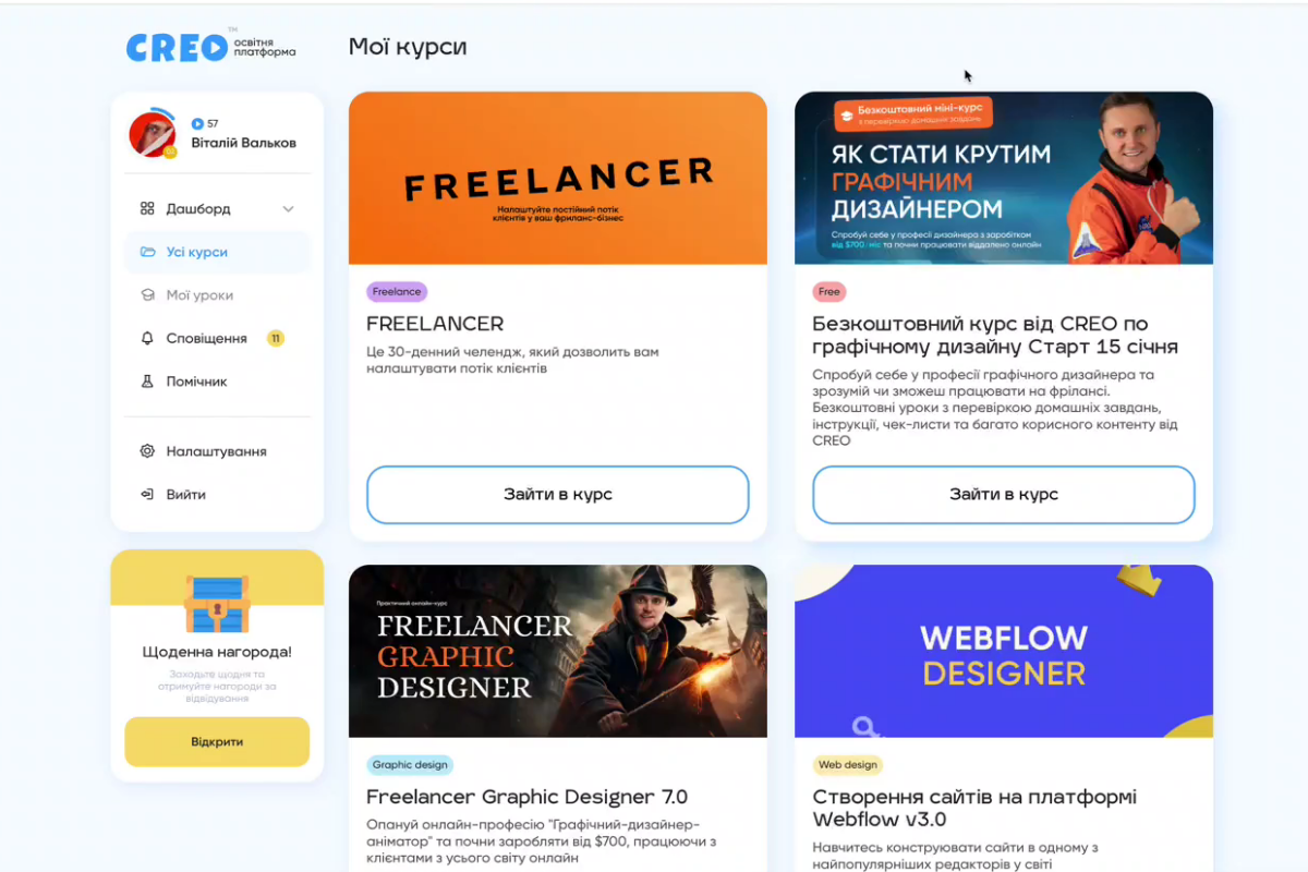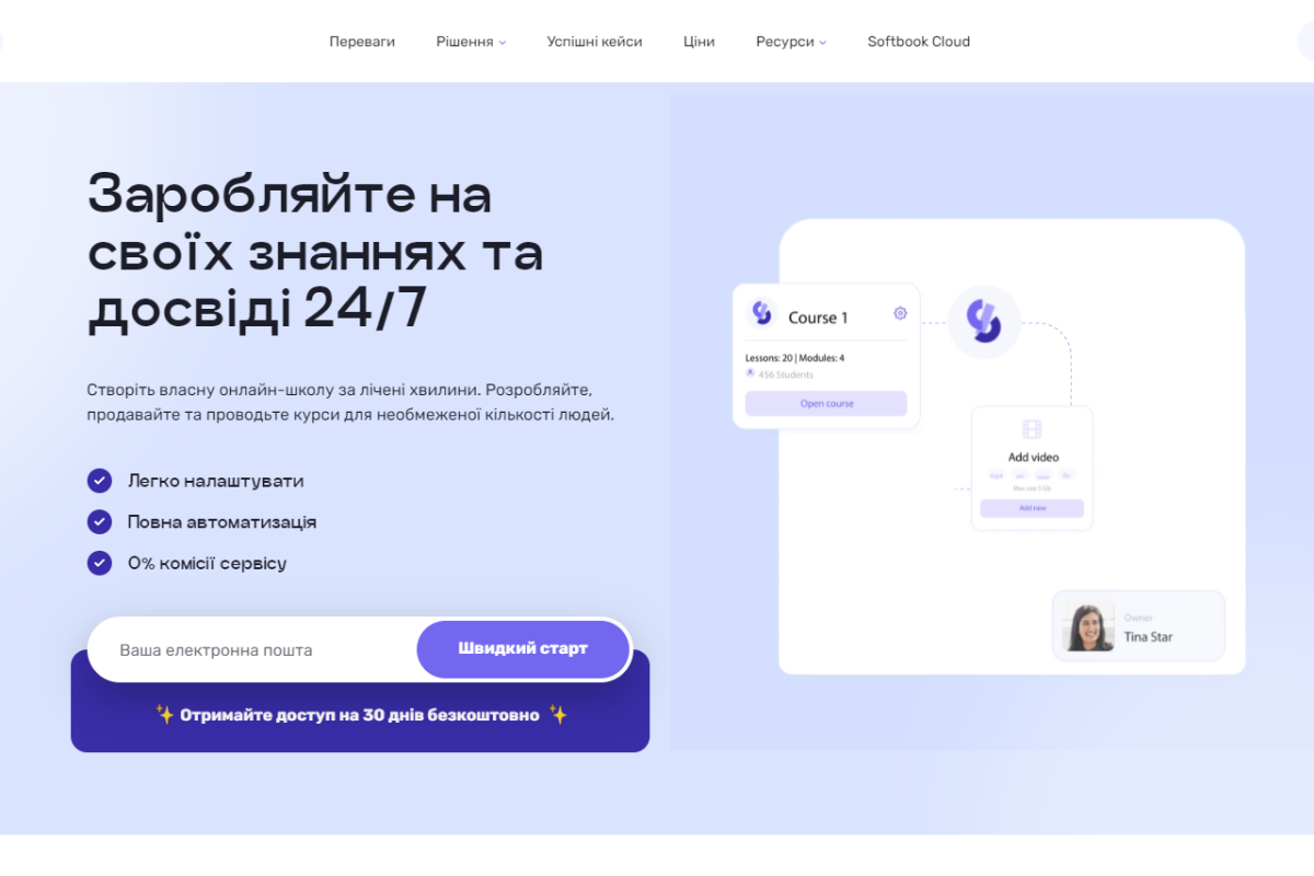 Платформа для продажу курсів, вебінарів та живих ефірів у Zoom. Особливістю є вбудований конструктор для самостійного налаштування та систематизація кожного елемента курсу.
