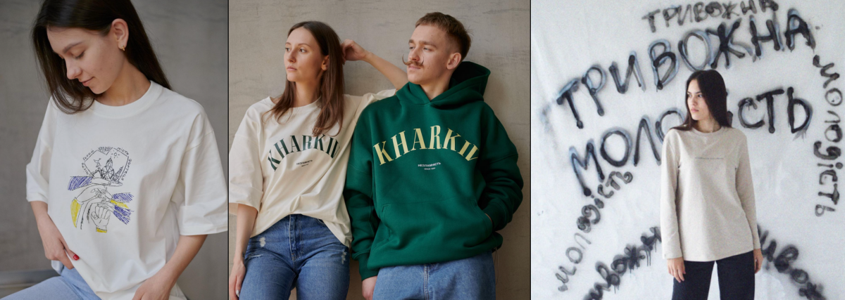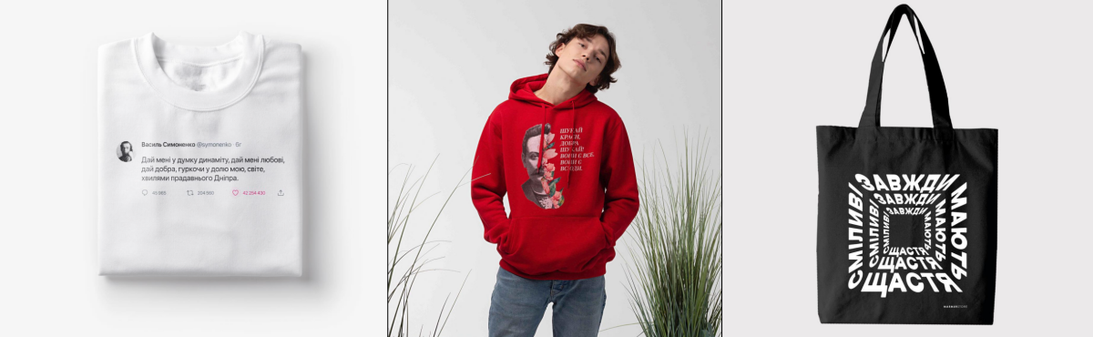 В асортименті худі, світшоти, футболки, екоторбинки та чохли для телефонів.