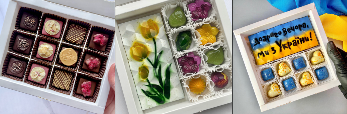 В асортименті – шоколадні плитки, серця та цукерки ручної роботи. Серед начинок — більш як 50 різних смаків. Є набори по 4, 6, 8, 12, 16 штук та тематичні пакування до свят.