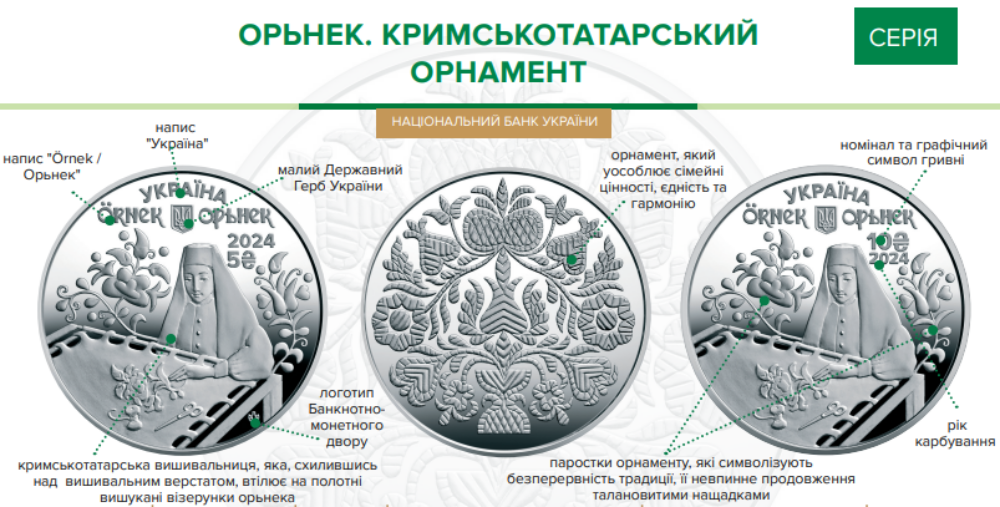 Про вартість та початок продажі монет “Орьнек. Кримськотатарський орнамент” в інтернет-магазині НБУ та в банках-дистриб’юторах буде повідомлено додатково.