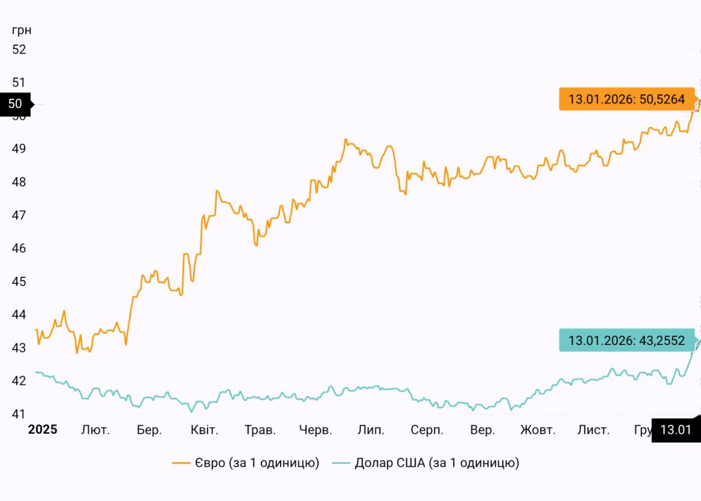 Зазначимо і минулого року січень починався з історичних рекордів, але потім курс укріпився і зрештою річна девальвація склала менше одного відсотка: з 42,03 грн/$ станом на 1 січня 2025 року до 42,39 грн/$ станом на останній день року 31 грудня.