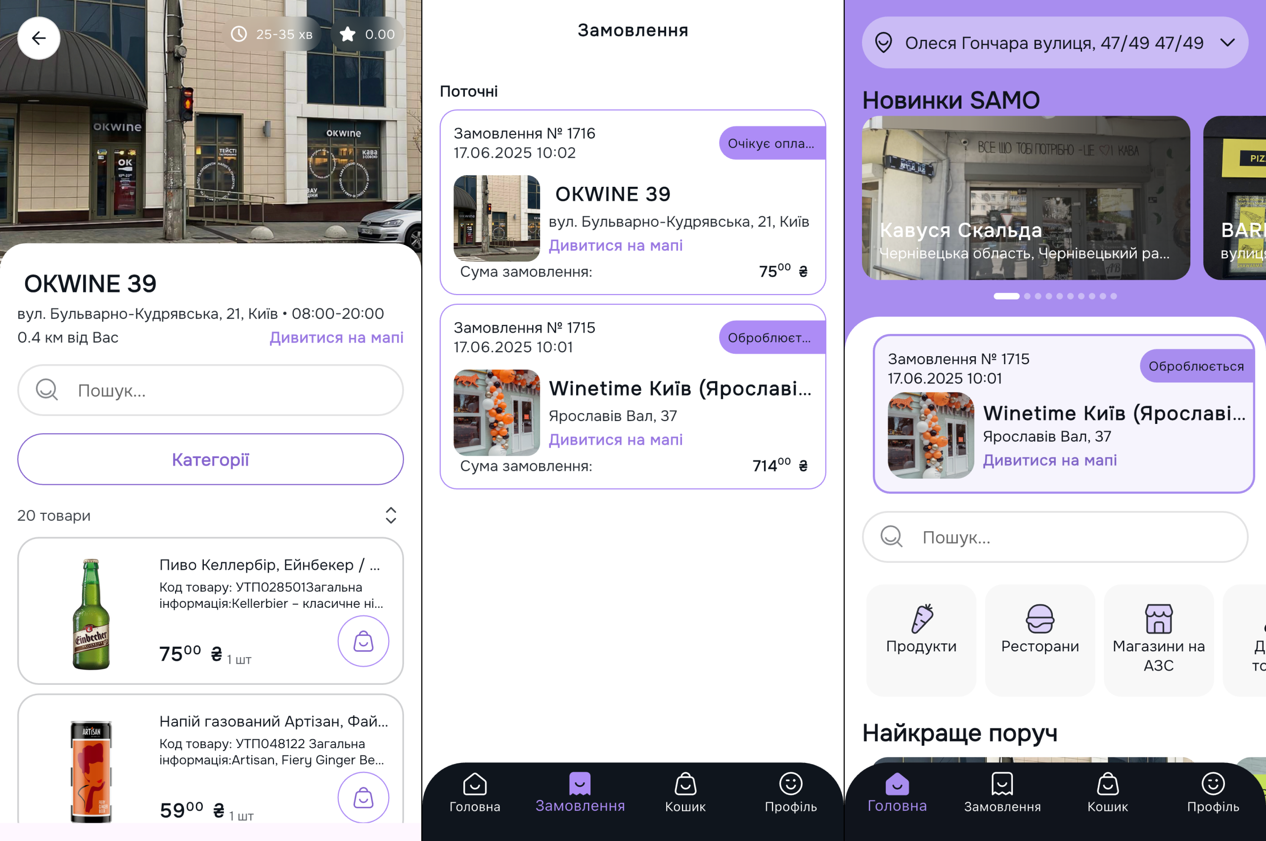 Загалом сервіс орієнтується на широку категорію товарів – замовлення в продуктових, дитячих магазинах, магазинах електроніки та зоотоварів, ресторанах, магазинах на АЗС, аптеках. Втім, поки доступно близько 700 локацій і за невеликим виключенням це лише мережеві магазини OKwine, Winetime, мережі АЗС WOG і Sokar.