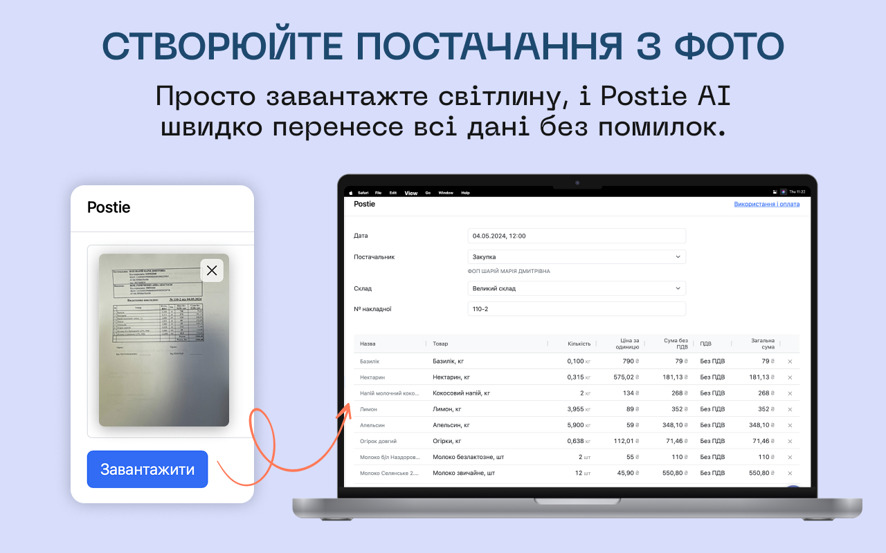 Застосунок зчитує фото накладної або чека, розпізнає текст і автоматично додає дані в систему: найменування товару, кількість, фасування, ціну тощо. Він зіставляє продукти із доданими в акаунті.