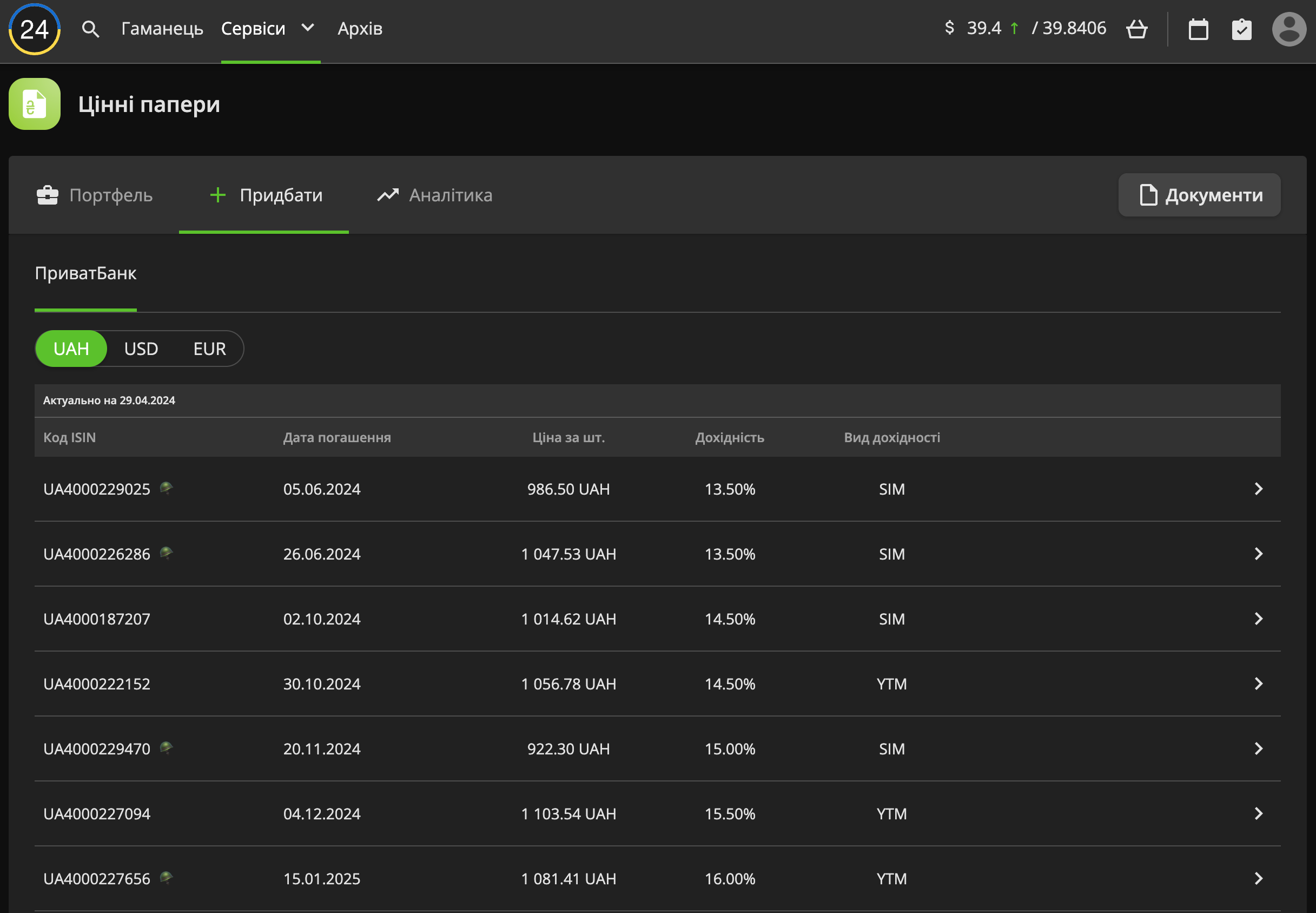 Водночас операції з облігаціями незмінно доступні лише у веб-версії “Приват24” – у розділ “Сервіси” обрати “Цінні папери”. Перед купівлею користувачам доступний калькулятор, який надає інформацію про відсоткову ставку, майбутній дохід, тощо. Всі угоди оформляються в електронному вигляді за допомогою електронного підпису.