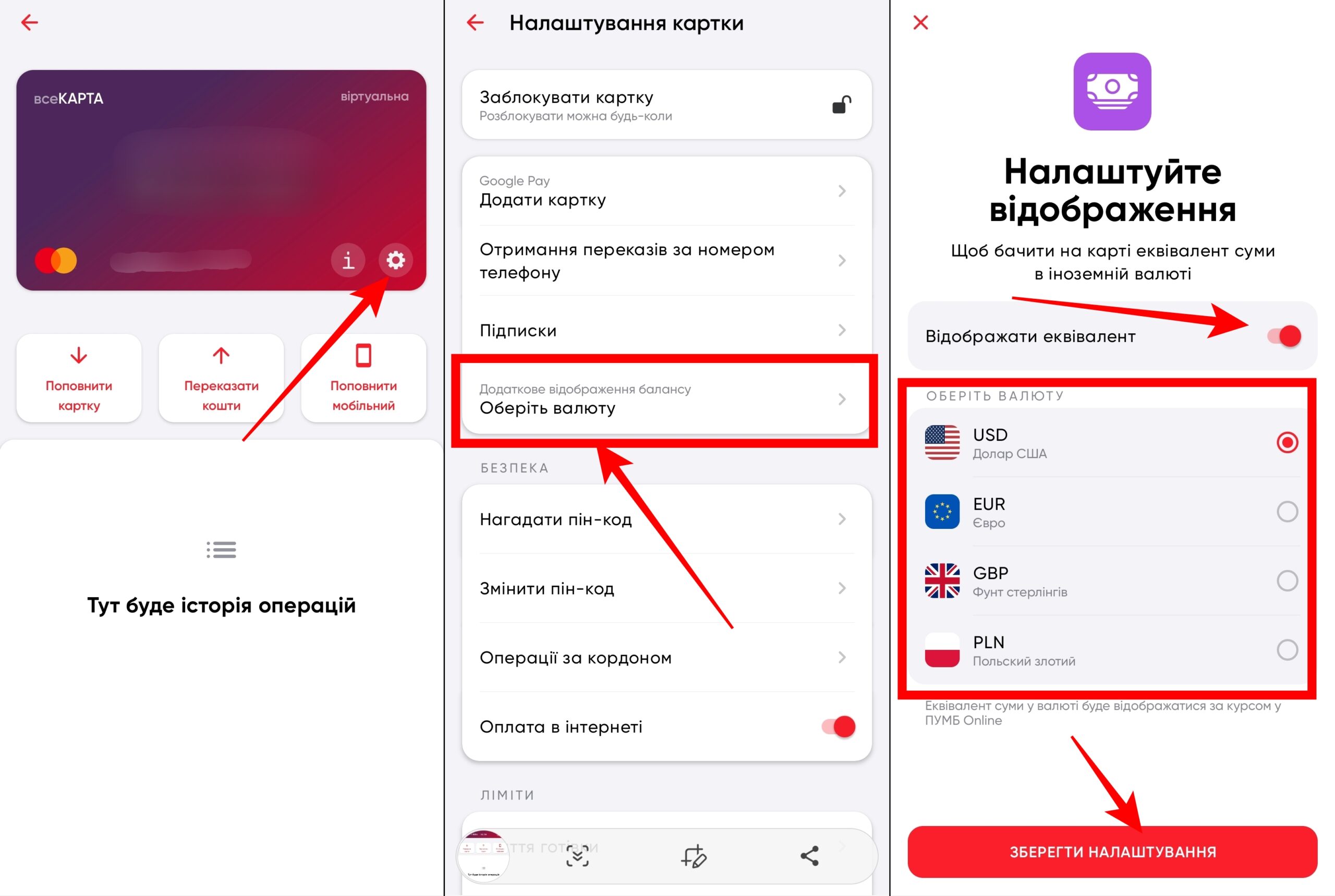Клієнти можуть налаштувати відображення коштів у доларах, євро, злотих та фунтах стерлінгів. Конвертація відбувається за онлайн курсом валют ПУМБ.