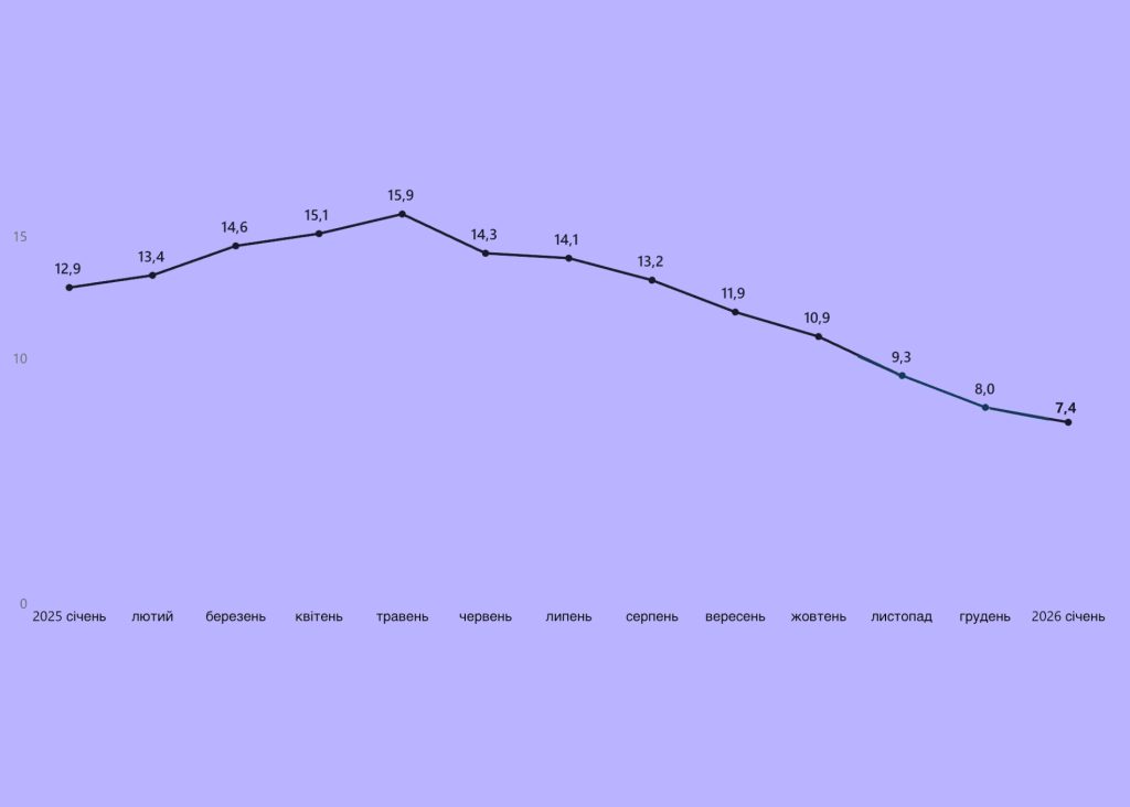 Інфляція у річному вимірі за підсумками січня зменшилася до 7,4%. За підсумками грудня вона була 8,0% та 9,3% за підсумками листопада. Оновлені дані опублікував Держстат.