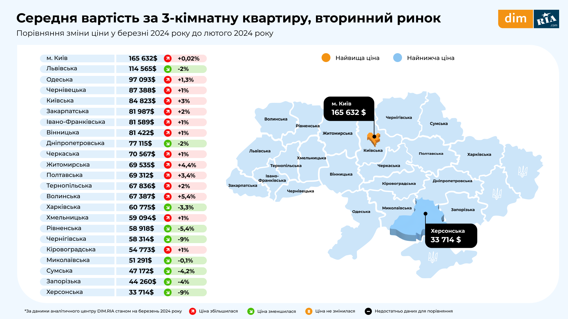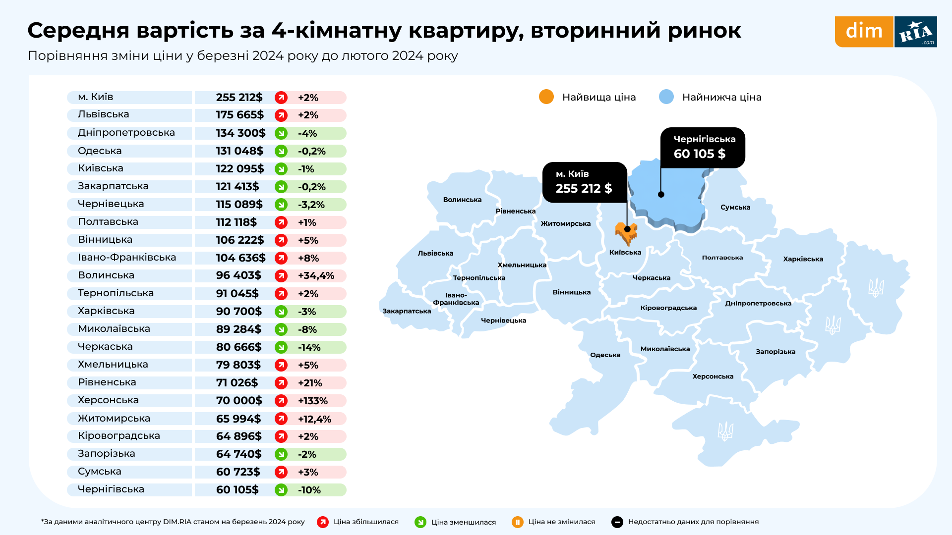 За даними DIM.RIA, найдорожчими районами для купівлі та оренди в Києві традиційно залишаються Печерський та Шевченківський. Найдешевше житло – у Деснянському районі. Середня ціна оренди однокімнатної квартири в Києві у березні 2024 року становила 17849 грн, а в Київській області – 9017 грн.
