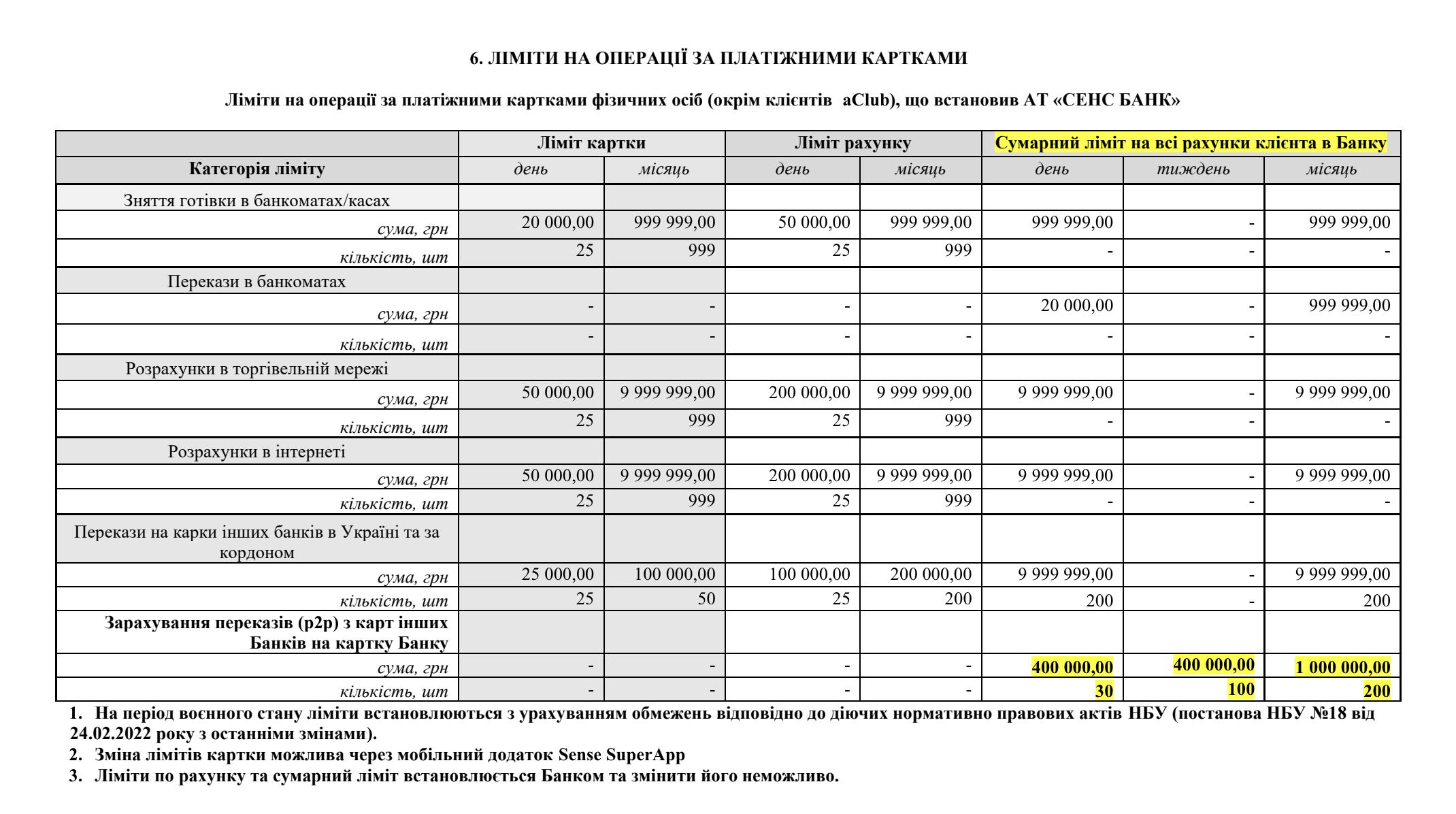 Ці ліміти діють на всі рахунку клієнта в “Сенс Банк” безвідносно кількості карток чи рахунків.