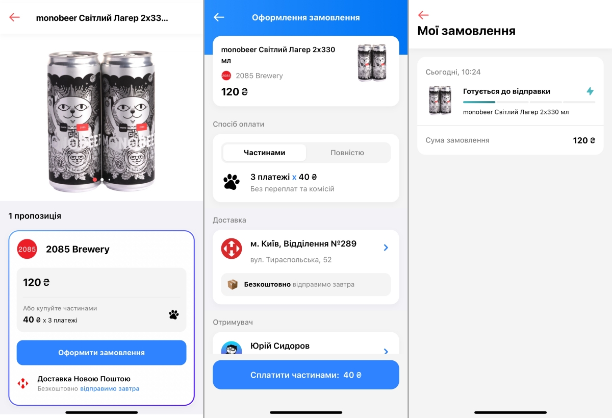 Всі замовлення і деталі за ними відображаються в окремому меню, доступ до якого через іконку в правому верхньому куті. Окрім загальної інформації доступний статус товару (готується до відправлення), номер ТТН і адреса доставки.